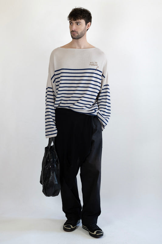 Men's Merino Breton Shirt, Chalk White/Faded Navy Stripes