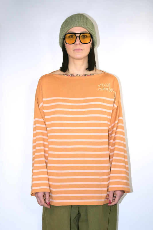 Women's Striped Breton Shirt - 100% Organic Cotton - Boat Neck - Cognac / Powder Stripes