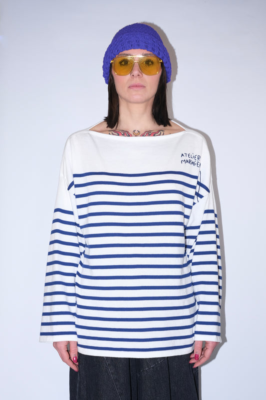 Women's Striped Breton Shirt - 100% Merino Wool - Boat Neck - Cream / Blue Stripes