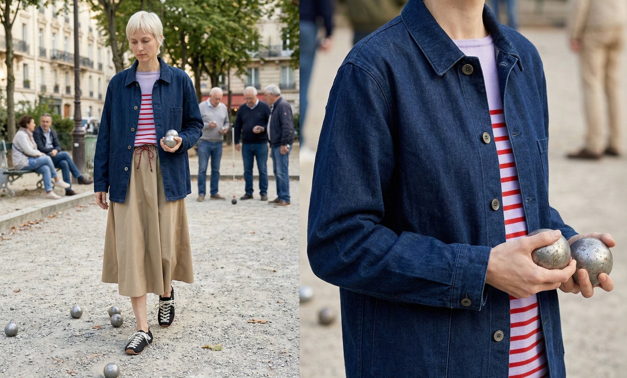 Morning light cutting across wide boulevards. A French Work Jacket resting on the shoulders on the way to a Sunday market, espresso in hand, newspapers folded under the arm. Underneath, Breton stripes — the quiet kind — breaking the silhouette with a familiar rhythm.