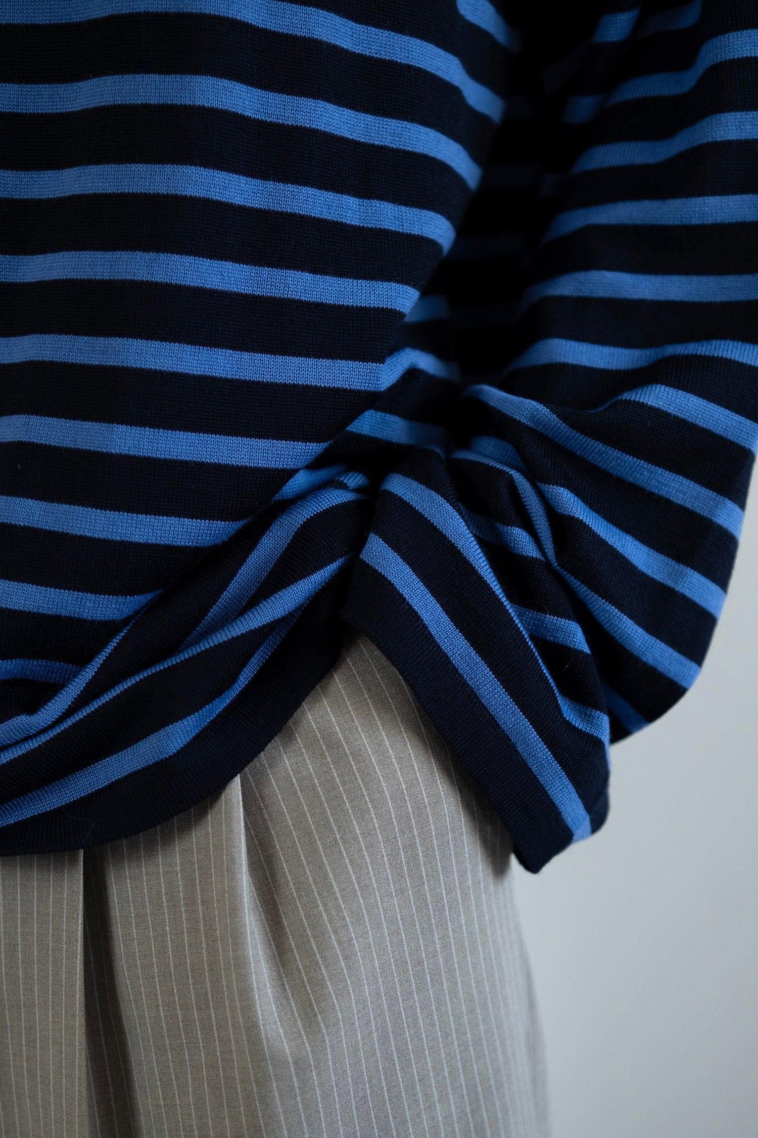 Cut in our signature relaxed silhouette with a boat neckline and softly elongated sleeves, it balances generous volume with clean structure. The blue navy base with dusty blue stripes creates a bold yet refined contrast.