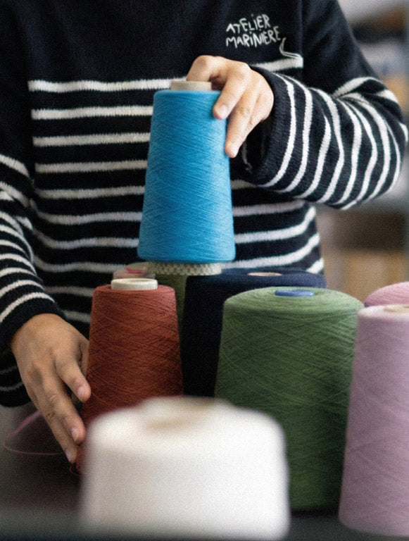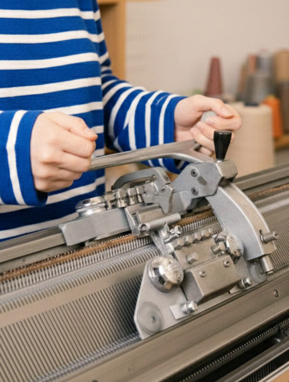 Our marinières are knitted one by one, not mass-produced. This way of working allows us to stay close to the process and to oversee every step, from the yarn to the finished piece. Working this way means each marinière can be individually checked and refined, so every garment meets the same standard of quality and finish. It’s a slower approach, but one that gives us full control over how each piece comes to life.