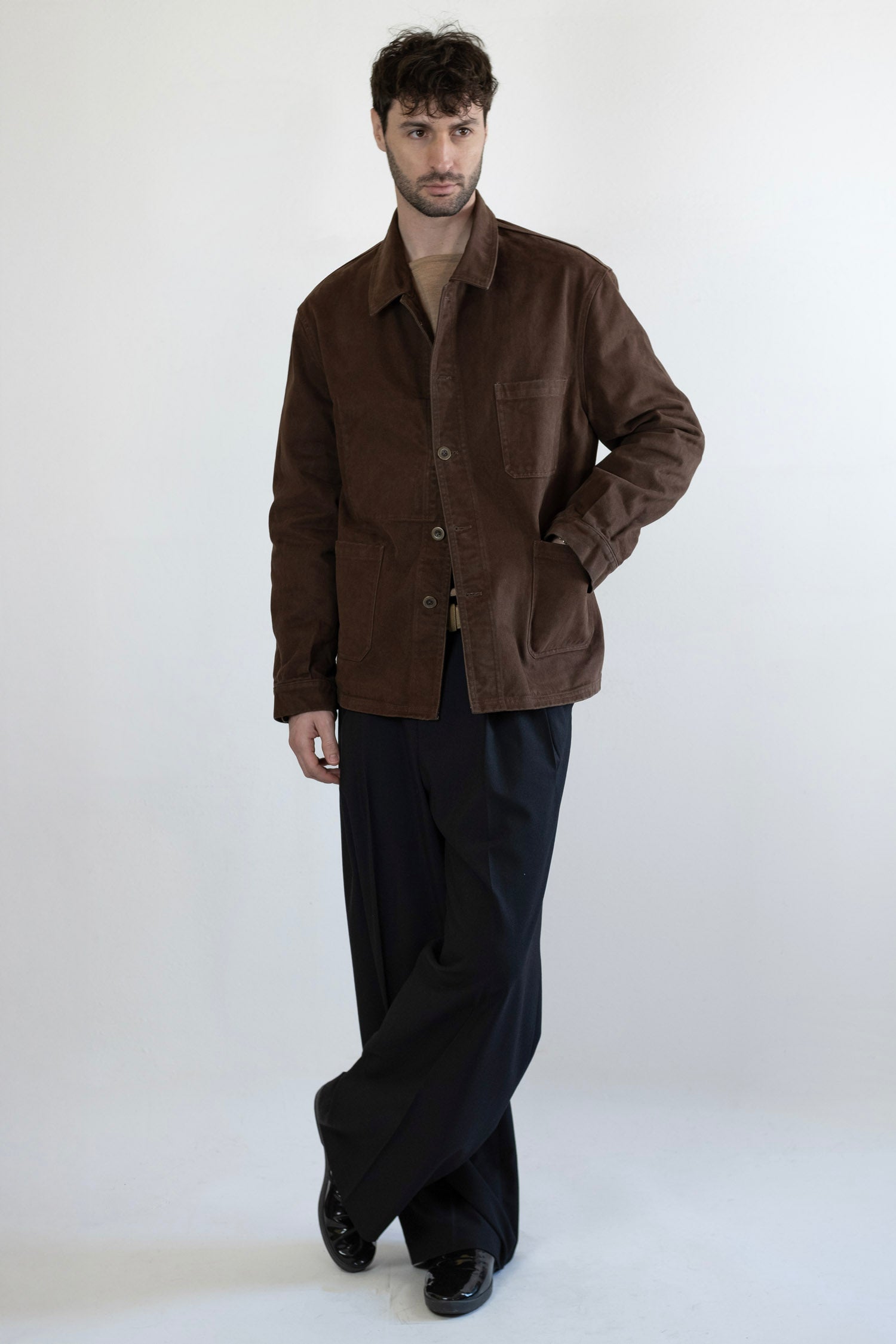 Cut with a clean, straight line, it features three patch pockets, an inner pocket, and metal buttons inspired by original chore jackets — refined rather than reproduced.
