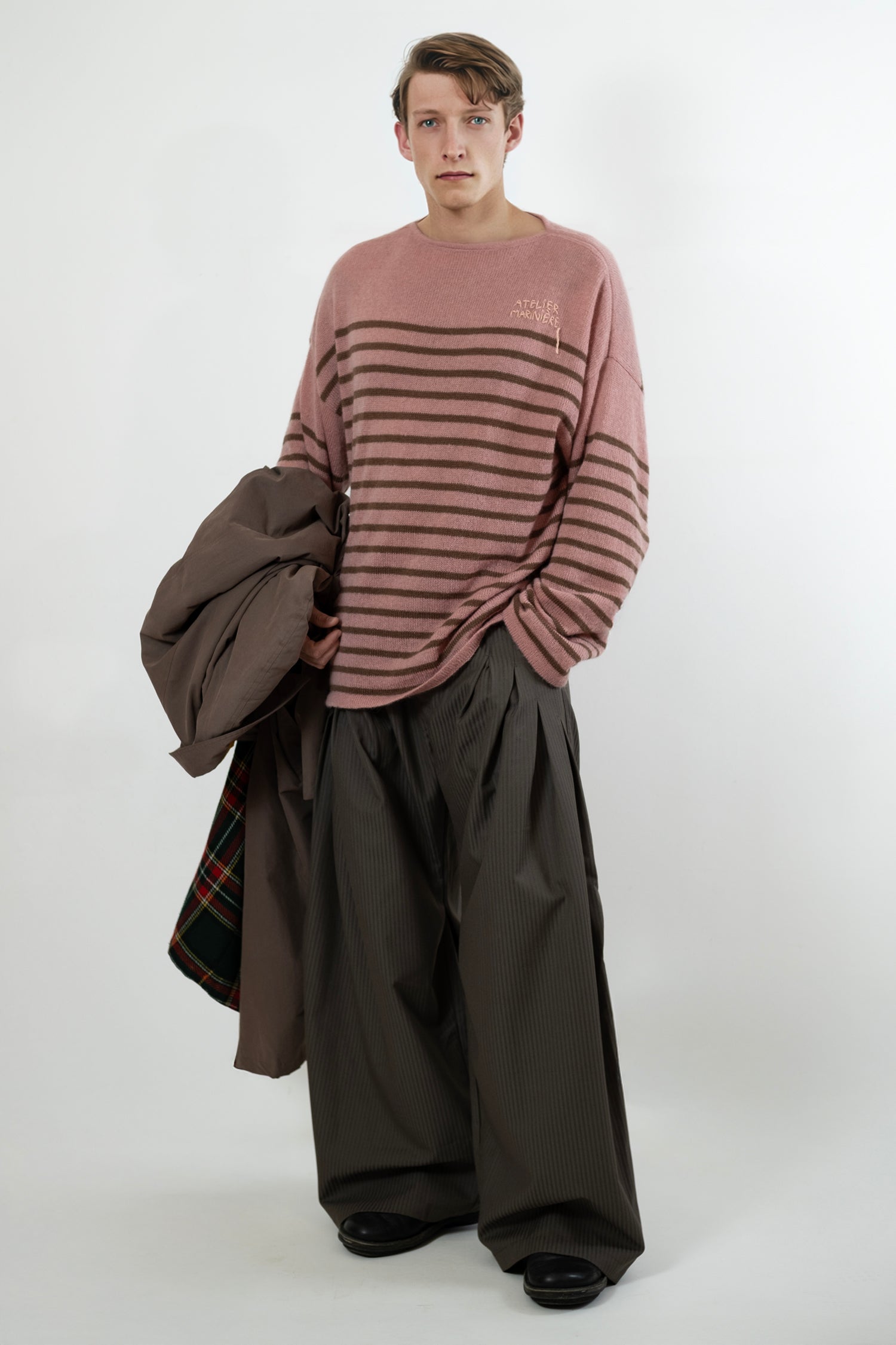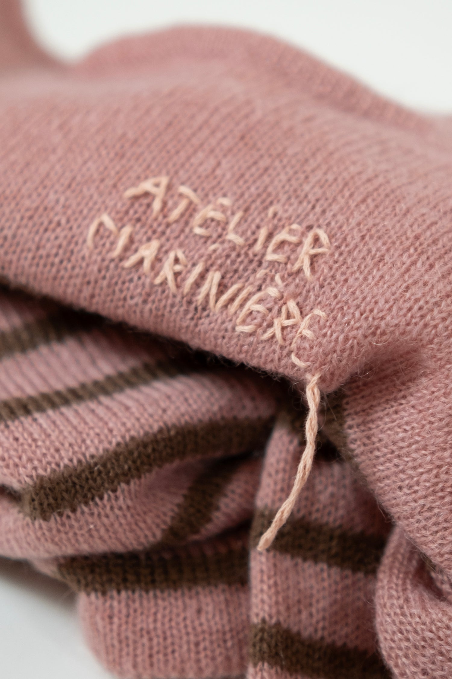 The silhouette is slightly oversized, paired with a narrow boat neckline that frames the collarbone with a clean, modern line. Each sweater is completed with hand-stitched embroidery, giving every piece its own quiet signature.