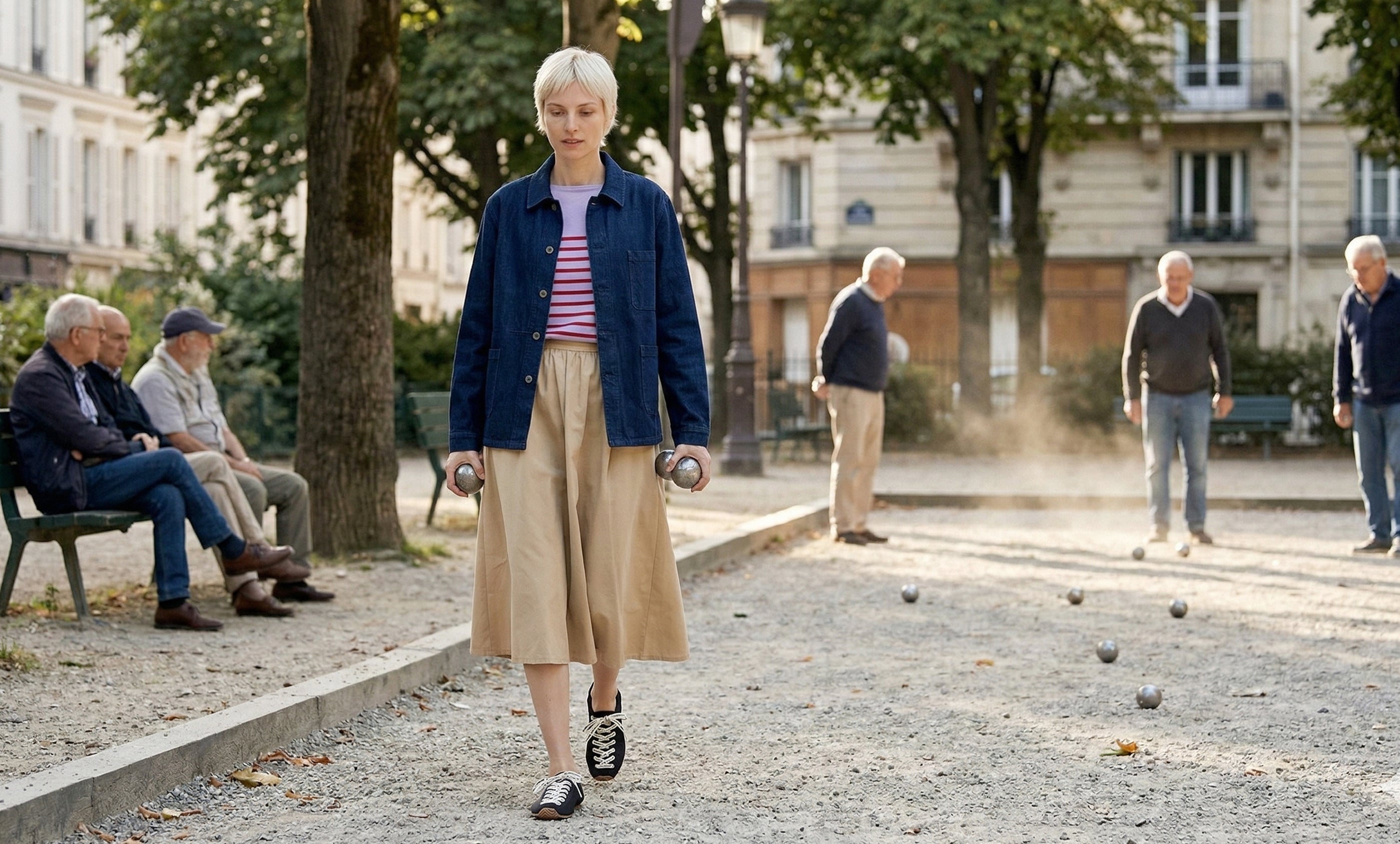Breton stripes underneath, breaking the silhouette with a familiar rhythm.