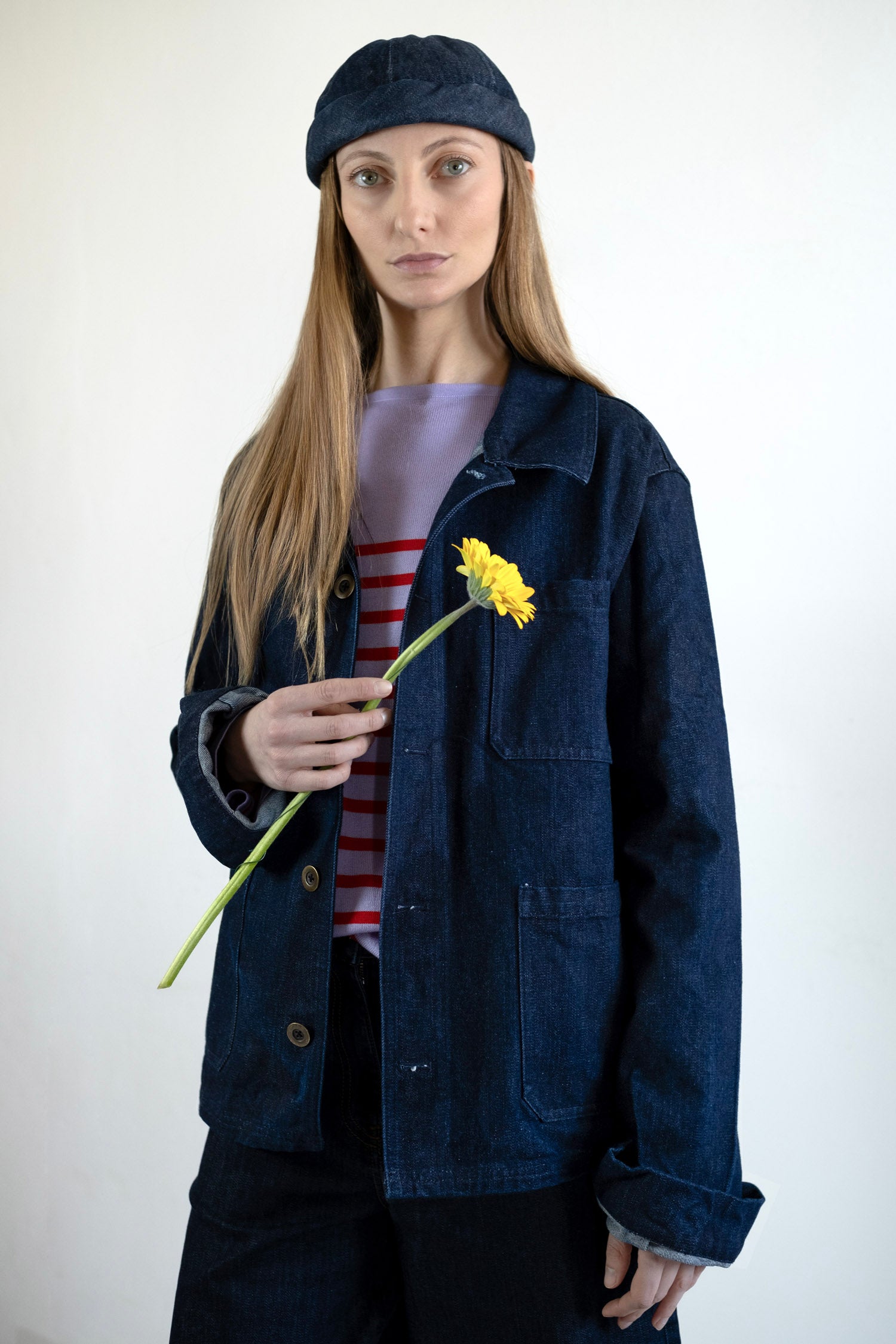 A 100% cotton raw Japanese denim French work jacket for women, cut in a structured, relaxed fit.