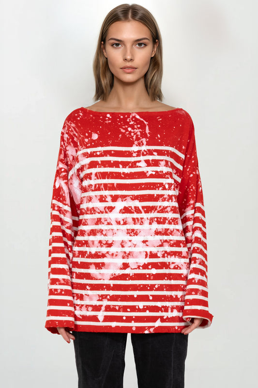 Women's Tie Dye Breton Shirt – Red / White Stripes, 100% Cotton, Boat Neck